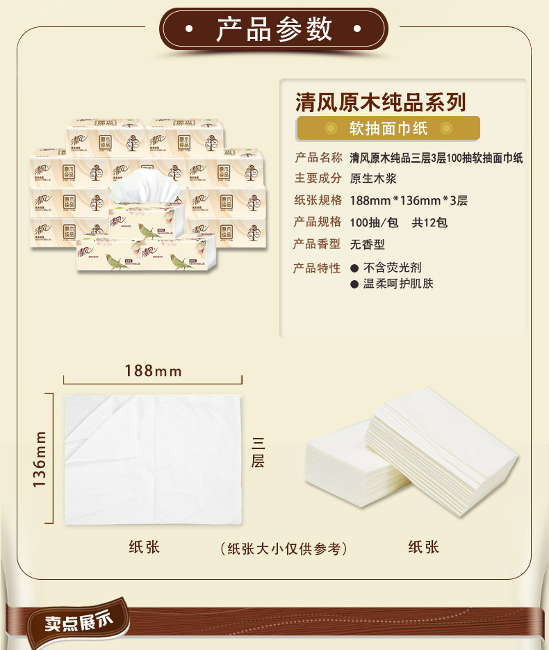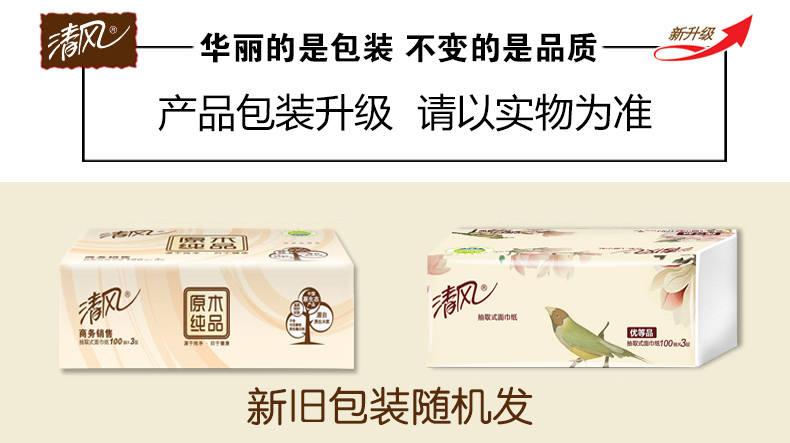 清风 【第二件立减5元!多买多减!】抽纸原木纯品纸抽卫生纸3层餐巾纸共12包面巾纸家用纸巾抽纸